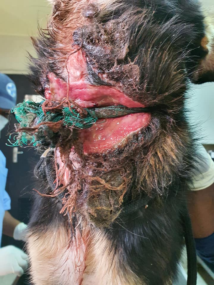 However, the inspector saw that a rope was tied around her neck. At first glance, you would think it is just a collar until you look closer and the rotten smell hits your nose. Around the dog’s neck was a collar so tight it cut right through the dog’s neck into the skin. The skin around the dog’s neck has started to rot and the poor animal must have been in tremendous pain.