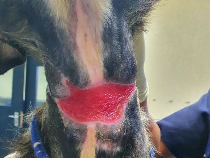 Our veterinary team immediately cut the rope of the poor animal’s neck and started cleaning the wound. Hair around the wound was shaved off and special care was taken as to not inflict any more pain on the animal. What startled the staff the most was that by looking at the wound and just imagining the pain the animal must have been in you would have thought she would try to bite or to run away. Yet she sat still and let the medical team help her as if she knew they were there to help. Wagging her tail the whole time, she sat patiently through the whole process.